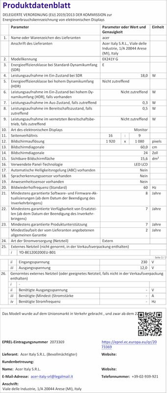 Monitor 60cm (24") Acer EK241Y G IPS FullHD 75Hz VGA HDMI